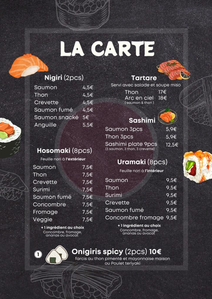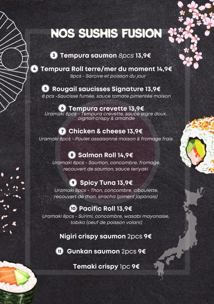 Découvrez la carte Découvrez nos menus Découvrez nos sushis fusion Découvrez nos plats chauds Découvrez nos accompagnements